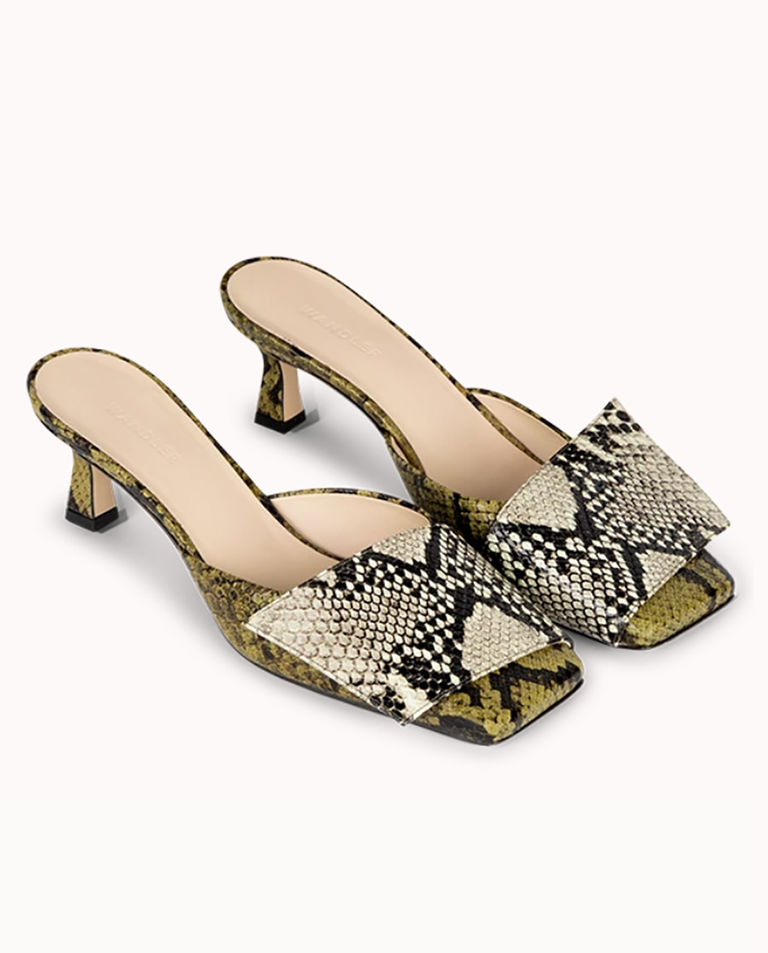 W sytuacjach, kiedy dress code nie pozwala na odsłonięcie palców u stóp, skórzane sandały nie są akceptowane. Można jednak wybrać równie wyjątkowe skórzane mule, które w przypadku Elizy Wandler są eleganckie i ponadczasowe. Model z modnym motywem skóry węża wykonany z delikatnej, a zarazem odpornej skóry cielęcej cieszy się wysoką popularnością. Klasyczne klapki typu mules, aby dodać formie lekkości, zostały wyposażone w stabilny niski i wąski obcas. Przody z zakładkami w odcinającym się odcieniu kreują elegancję i ponadczasowość modelu.